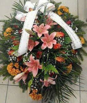 Wieniec pogrzebowy duży , lilia, chryzantema gałązkowa, gipsówka, goździk, zieleń dekoracyjna, szarfa.