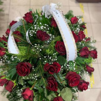 Wiązanka pogrzebowa floret, na stroiszu świerkowym, Kwiaty chryzantema gałązkowa, mini gerbera, goździk gałązkowy, zieleń dekoracyjna. szarfa z napisem