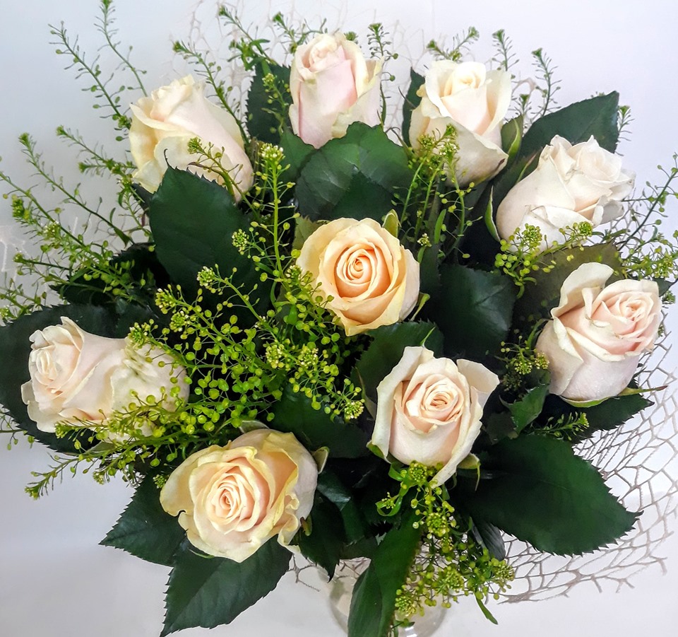 Bukiet 9 róż z zielenią dekoracyjną w koronce