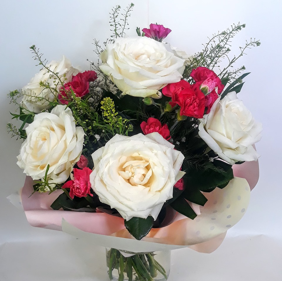 Bukiet średni  z białej wielkokwiatowej róży z różowym goździkiem z dekoracyjną zielenią
