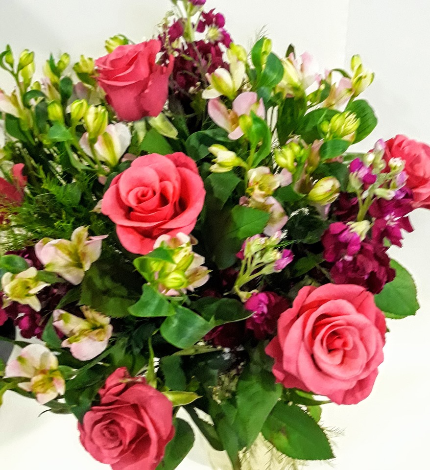 Duży kolorowy bukiet alstromeria , róża , gipsówka , lewkonia, zieleń dekoracyjna .
