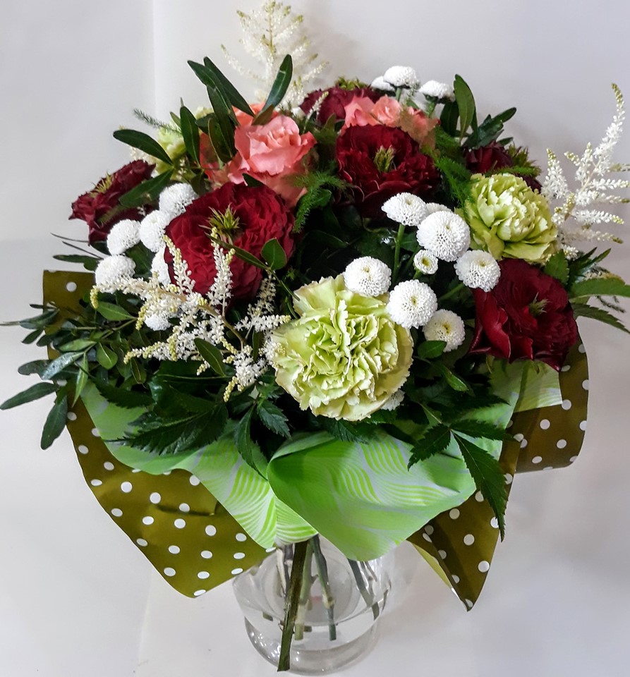 Średniej wielkości bukiet z róż , goździków, santini, dodatki dekoracyjne wszystko wykończone pasującą kryzą.