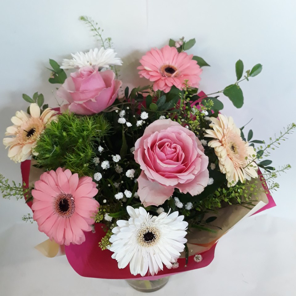 Bukiet średni z gerber róż i dekoracyjnej zieleni