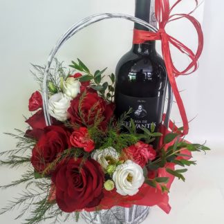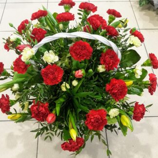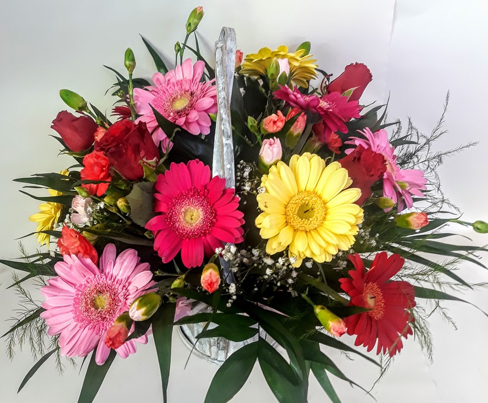 kosz, gerbery, róże, goździki gałązkowe, zieleń dekoracyjna