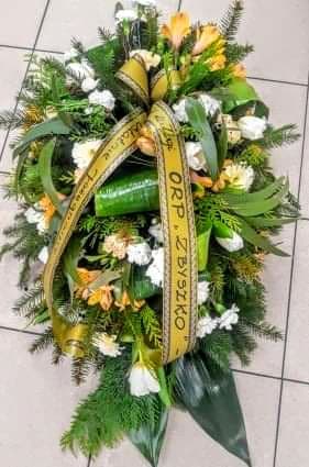 Duża wiązanka pogrzebowa, alstromeria, goździk gałązkowy, eukaliptus, zieleń dekoracyjna , szarfa.