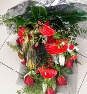 Wiązanka na florecie z róż, gałązkowych goździków , gerber, gipsówki i dekoracyjnej zieleni