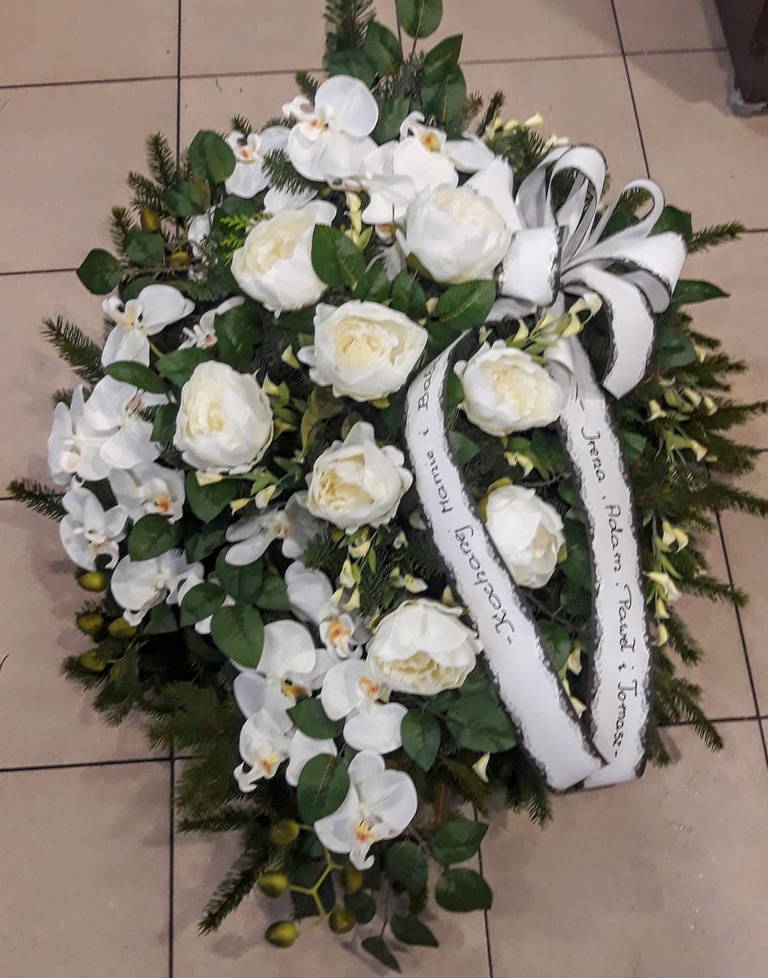Wieniec białe sztuczne kwiaty , piwonia pąkowa, lub róża , storczyk, zieleń dekoracyjna, dodatki . Całość wygląda bardzo ładnie kwiaty sprawiają wrażenie żywych . rodzaj kwiatów zależy od dostępności .