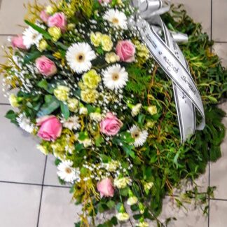 Duży wieniec pogrzebowy w kolorze pastelowego różu z delikatna zielenią dekoracyjną , róże, gerbery , goździk gałązkowy.
